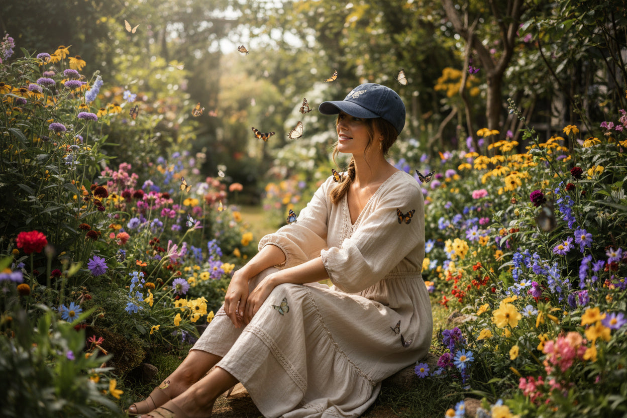 This stylish baseball style cap has a brushed faded cotton fabric with silk screened Butterfly/Daisies above the 2.76" brim. Makes a thoughtful gift for gardeners and nature lovers alike. Offers a comfortable fit and sun shade.