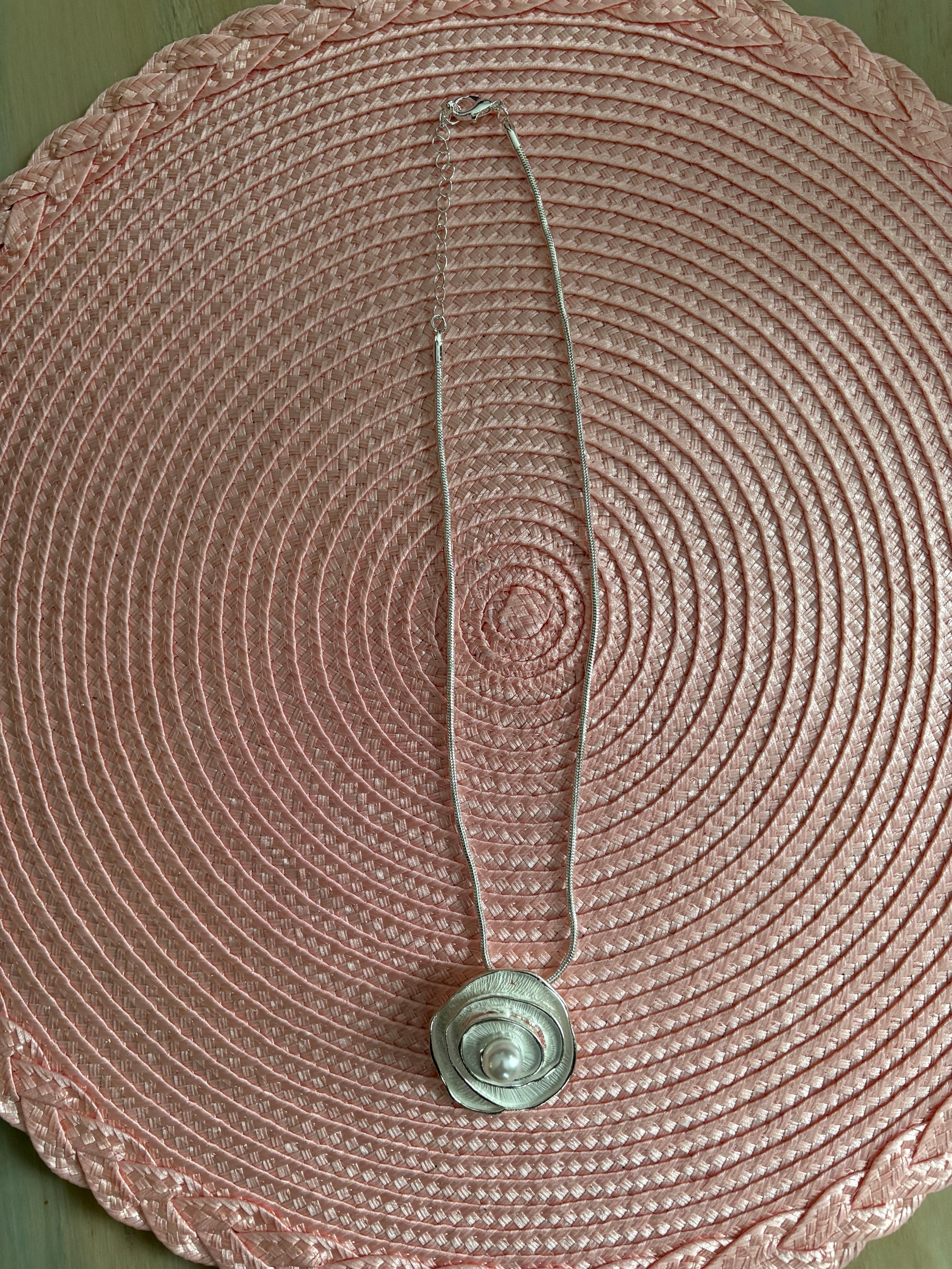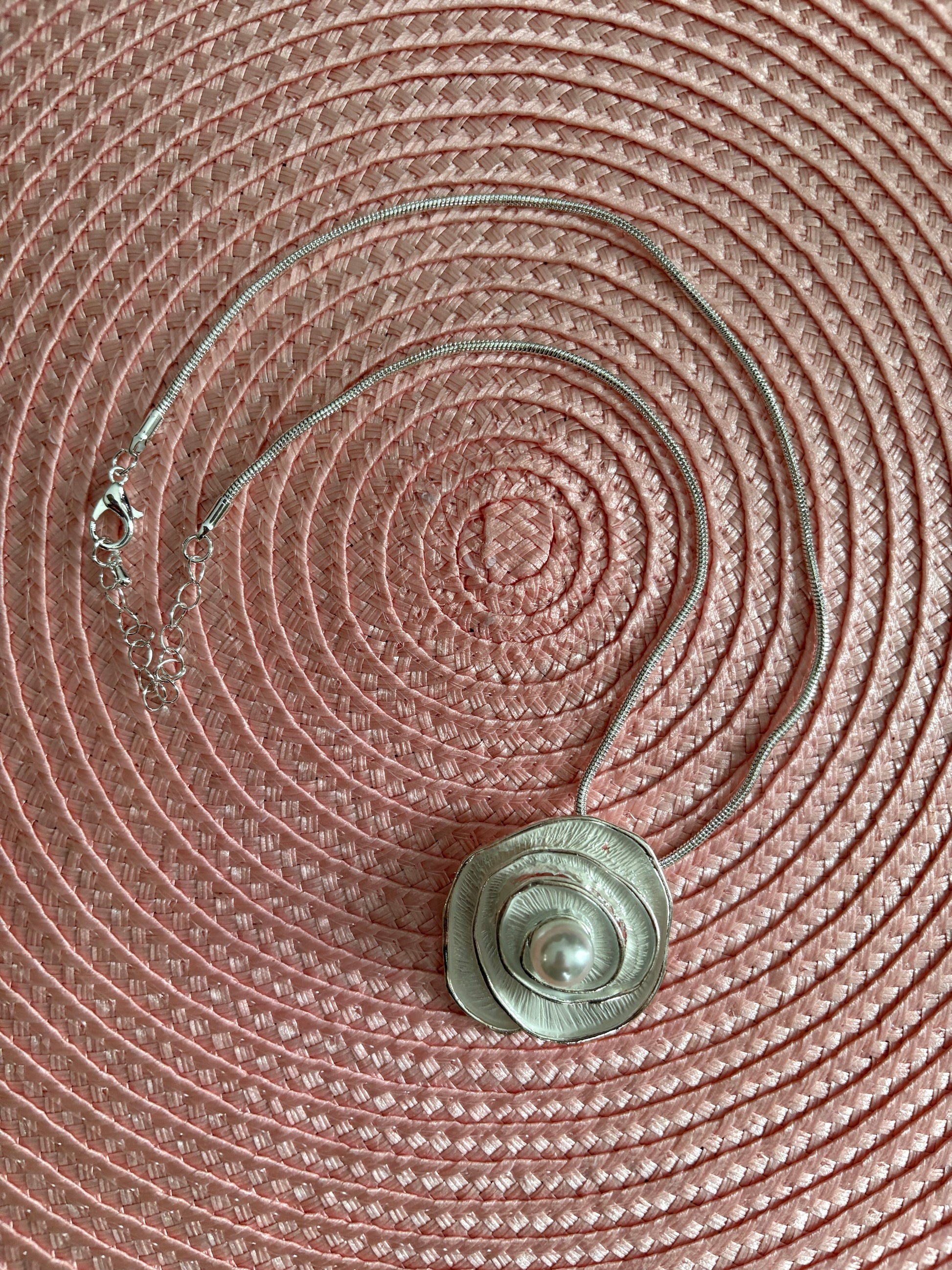 Beautifully crafted white flower pendant with silver rim and a synthetic pearl in the center.