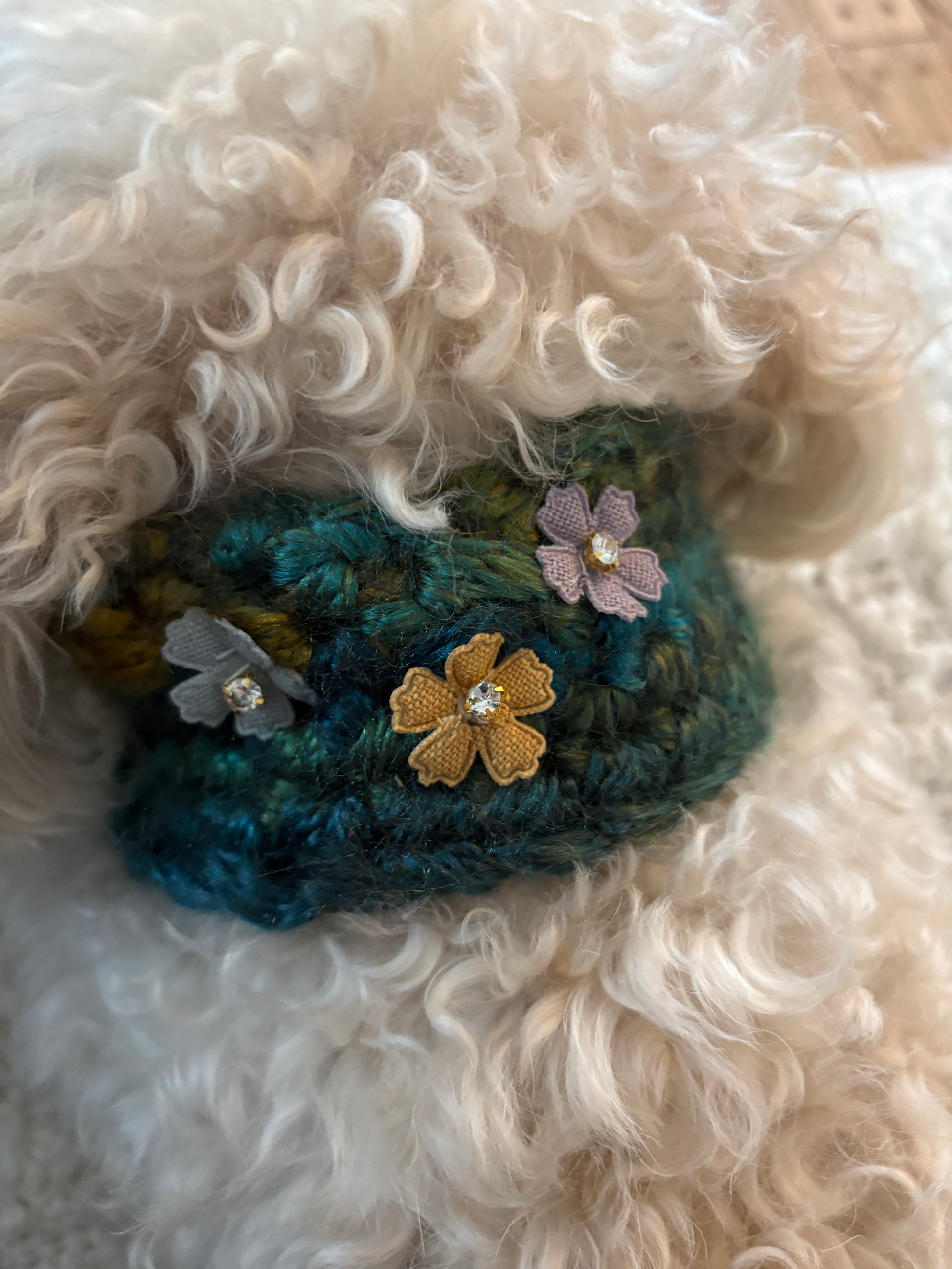 This hand crochet dog snood or neck warmer will keep you fur baby warm during those cold winter walks. Comes with floral applications.