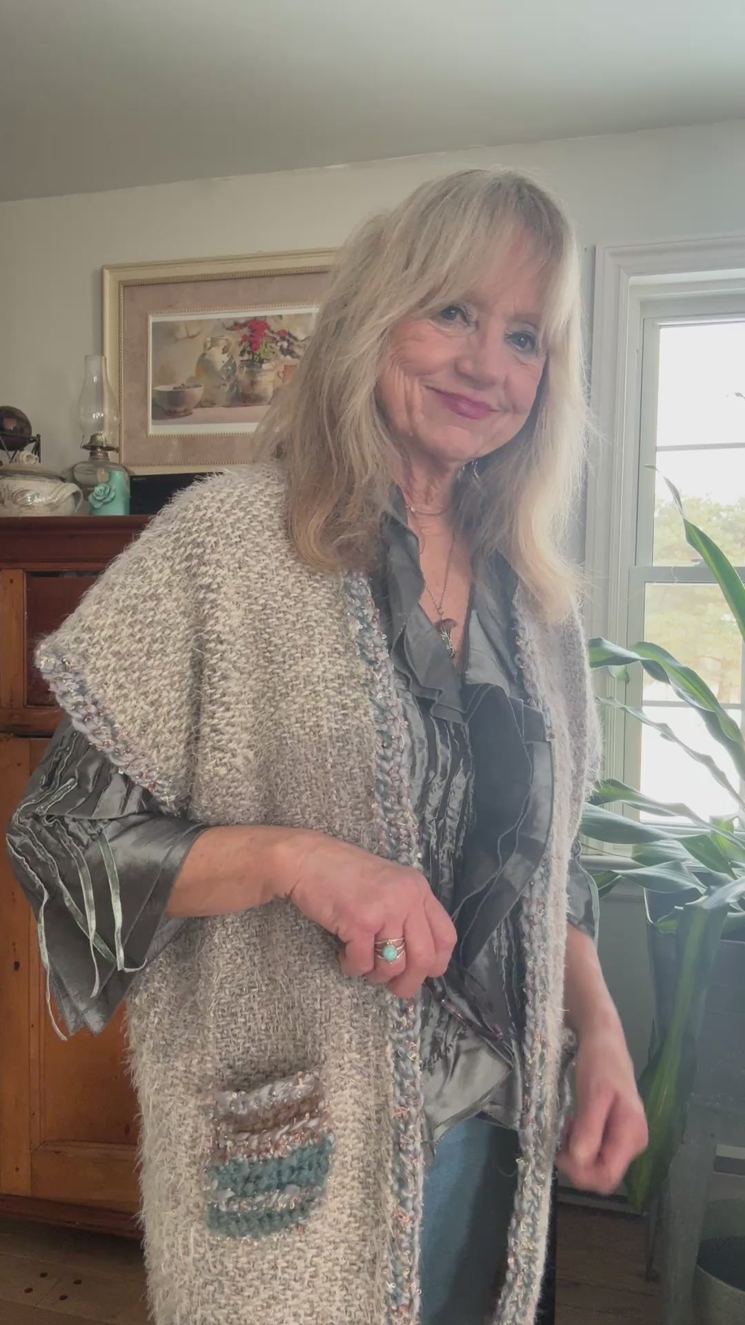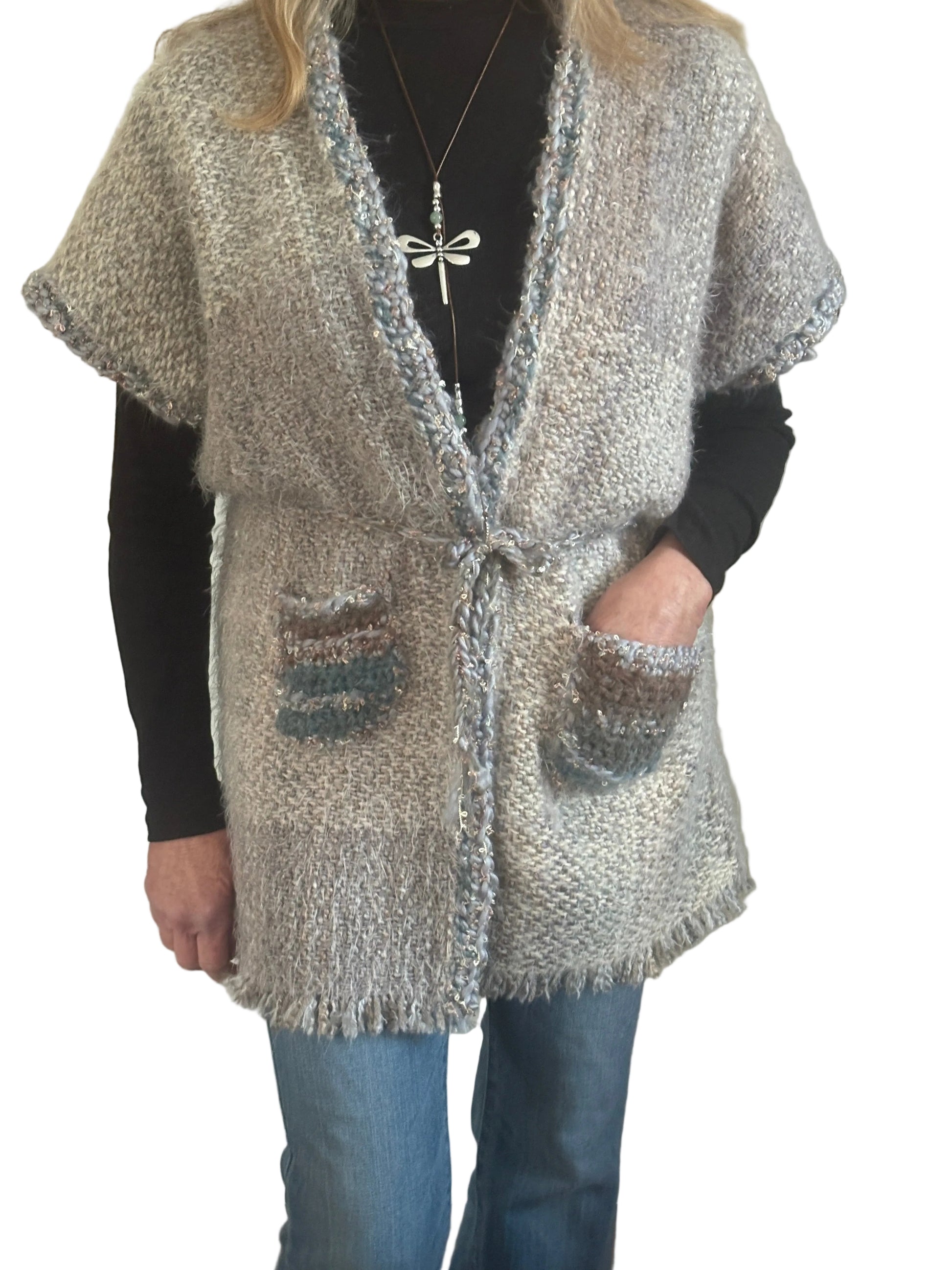 Handwoven acrylic/wool mid length vest with hand crochet pockets and matching crochet waist drawstring. Colours: grey, browns, gold, silver and blue. One of a kind & stylish, comfortable fashion accent for your wardrobe. Pocket large enough to hold cell phone and reading glasses.