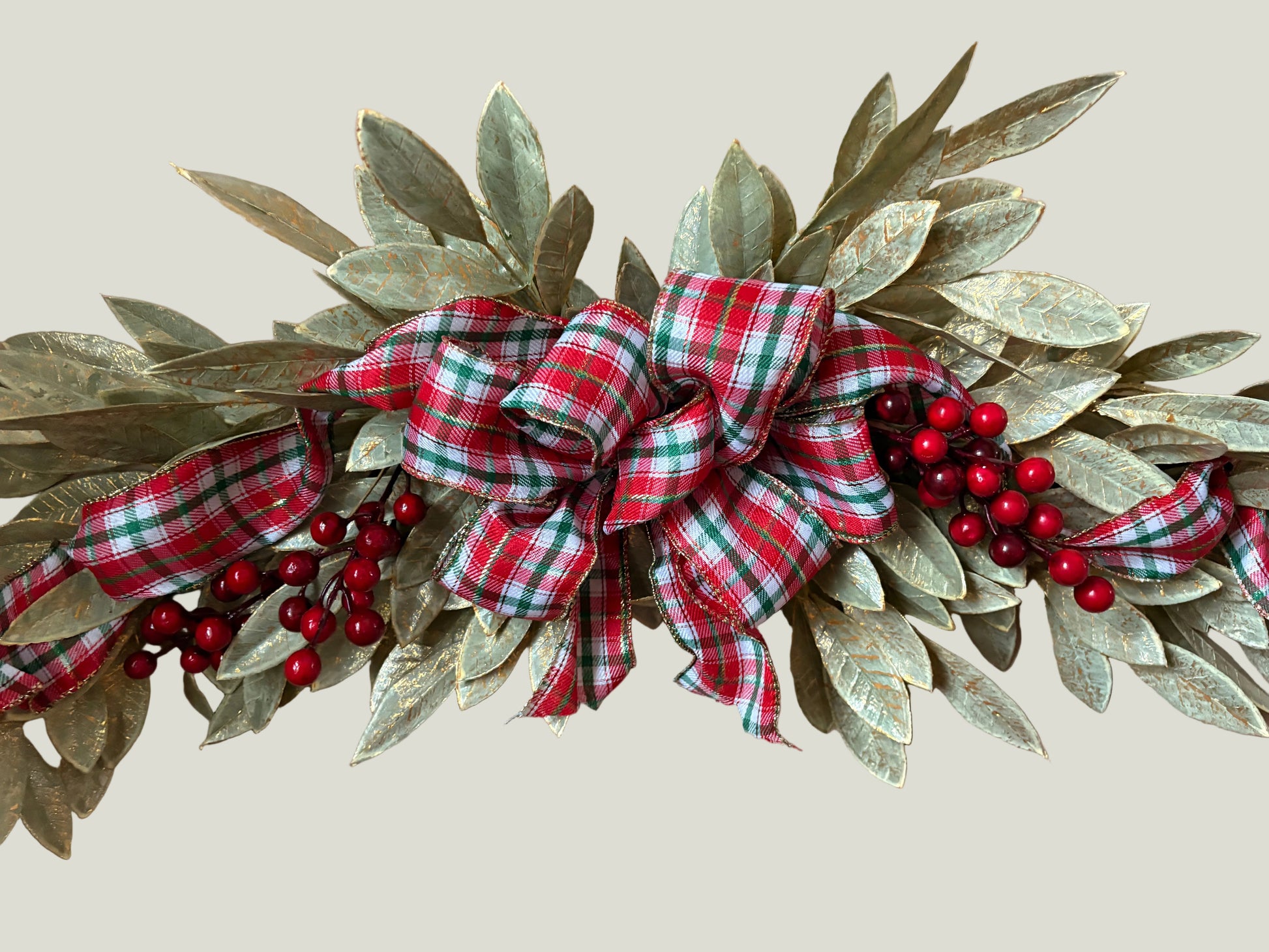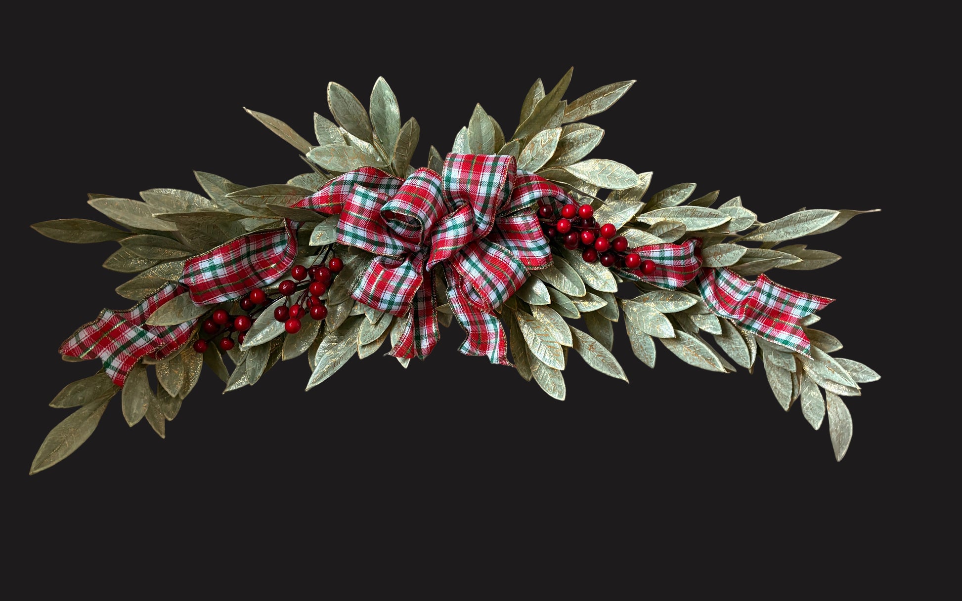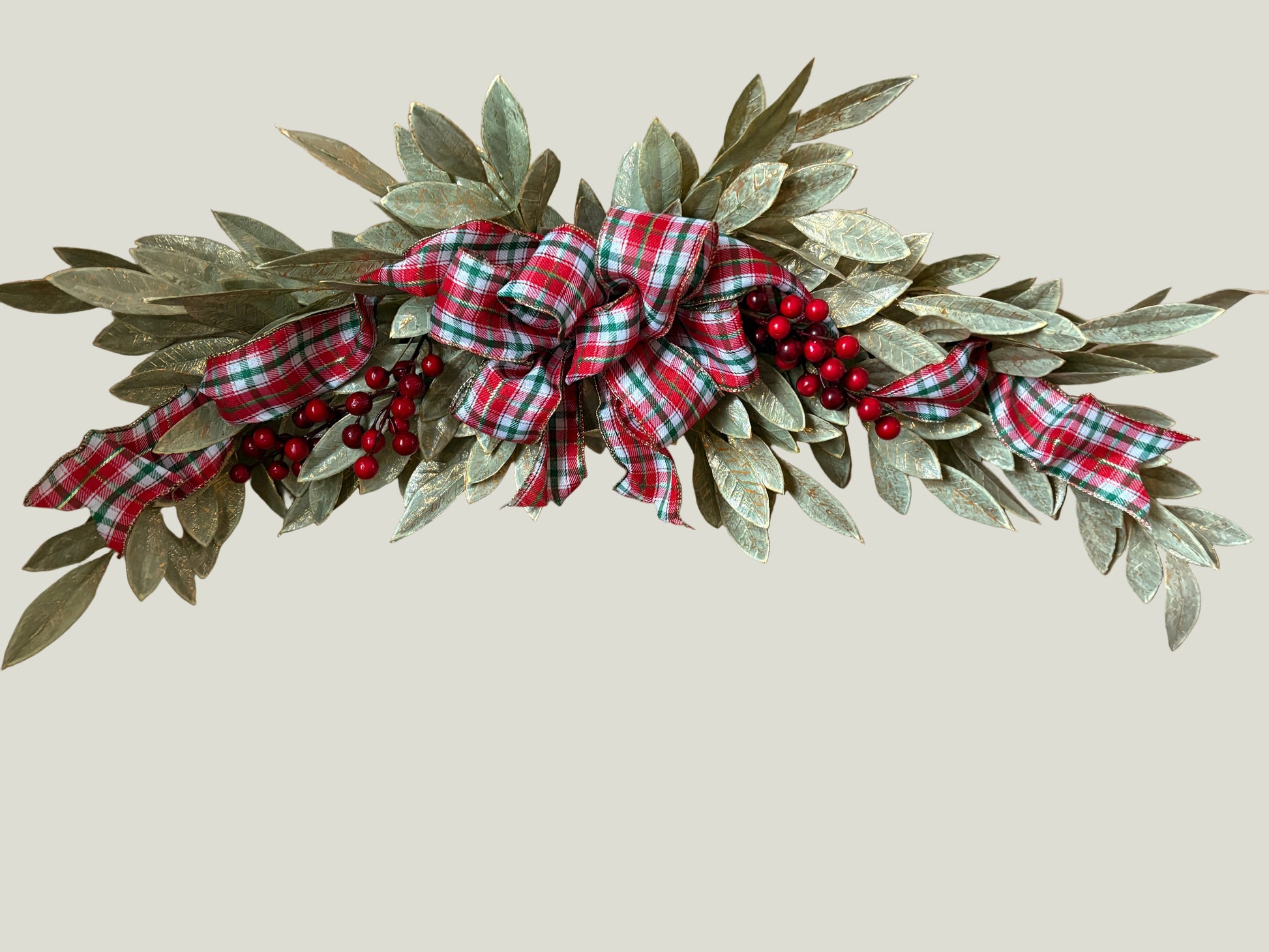 This pretty country style Holiday swag is adorned with a plaid ribbon and faux red berries. It looks beautiful over a door, window or picture frame. Great for Christmas time decorating in your home.